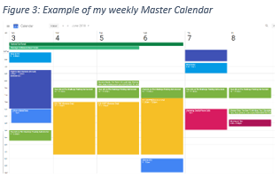 Extreme calendaring has several benefits. First, it prevents overscheduling. I see everything in my master calendar and know when I have room to schedule additional items. Second, it enhances my view of the big picture. Some weeks I might want to double down on marketing activities and master calendar reveals whether I have the right mix of activities scheduled. Third, it helps with process issues.
